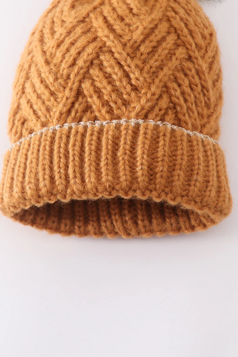 Camel cross cable knit pom pom beanie hat baby toddler adult—