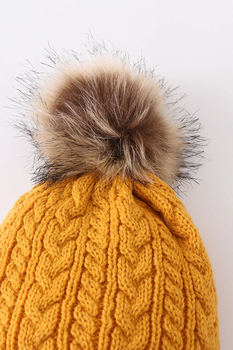 Mustard cable knit pom pom beanie hat baby toddler adult